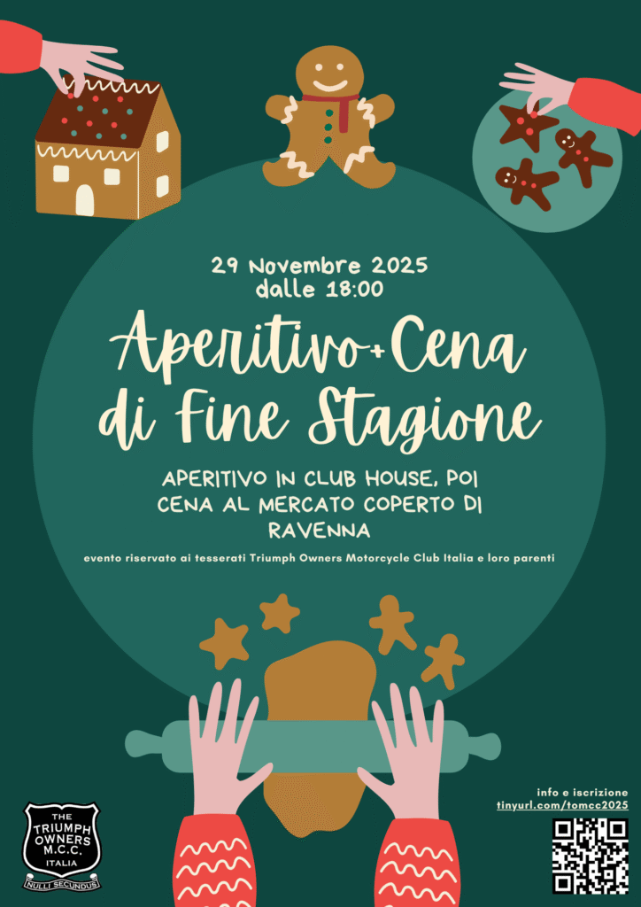 Ci ritroveremo Sabato 29 Novembre 2025 a partire dalle ore 18 presso la nostra Club House per un aperitivo, quindi faremo una passeggiata attraverso il centro storico di Ravenna per raggiungere il Mercato Coperto dove ceneremo. Programma, menù, costi, hotel consigliati alla voce Info e Iscrizione qui sotto.